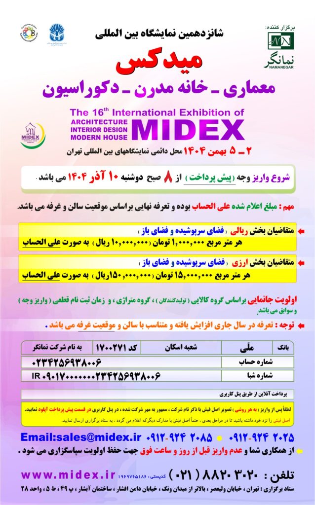 بدینوسیله از کلیه مشارکتکنندگان محترم نمایشگاه میدکس دعوت میشود نسبت به واریز وجه مطابق شرایط اعلامشده اقدام فرمایند.